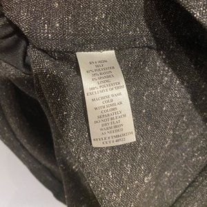 Front of dress has diagonal layer to bottom. Back of the dress has no layering. Zipper back. Dress is black with white fleck and has attached faux pearl neckline. Top inner bodice is lined.