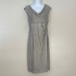 Chic metallic gray dress with a draped neckline. Ideal for elegant events.