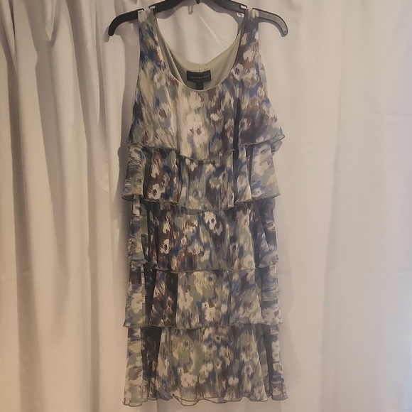 Vibrant sleeveless mini dress with cascading ruffles. Features a multicolor abstract pattern.