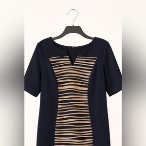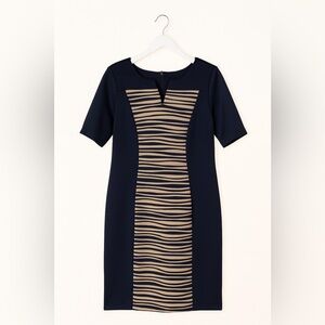 Elevate your wardrobe with this timeless Connected Apparel dress in a size 14. Featuring a sophisticated navy blue base with a tan patterned front panel, this dress offers a stylish slit neckline and a flattering, stretchy fit.
