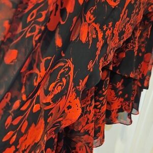 Elegant asymmetrical dress with red floral pattern on black. Perfect for wearing with a red or black blazer.