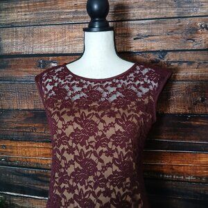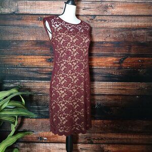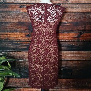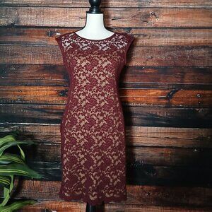 Connected Apparel Sheath Dress Size 8 Petite Wine Nude Lace Overlay Stretch Zip