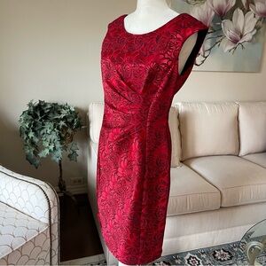 Connected Apparel red side ruched sheath holiday party dress. Beautiful red dress with black floral pattern. Lots of sheen for an elegant look. Back zip closure and slight cap sleeves. The bodice is lined. Approximate measurement laying flat: the bust is 17” and the length is 37.5”. Machine wash cold water. Excellent condition. Size 10