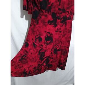 Beautiful floral dress from connected apparel in size 10. Made from polyester and spandex it has a lovely horizontal stretch and is quite wrinkle resistant making it excellent for travel. This dress features a round neckline and has short sleeves with a slightly flared skirt. It has an abstract print of black and red roses on a red background. The chest measurement is about 36-38 in. From the shoulder to the hem measures about 35 in.