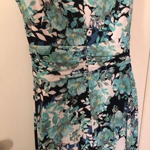 Flattering empire ruched waist with flowing, below-the-knee skirt. Bodice is lined. 44” from neckline to hemline. 14” side to side at empire waist. Beautiful floral print with light aqua, white, Grey, blue on black. Excellent preowned condition.