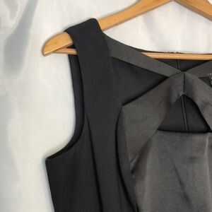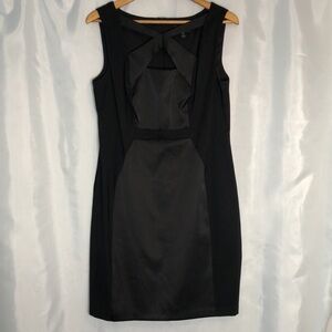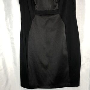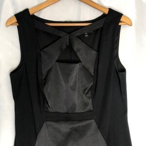 A classic sheath dress with a twist. Solid side panels promote an hourglass figure while the satin pops X-neckline detail draws the eye up toward your face Feel confident to command the room and comfortable to run from one meeting to wedding Pit to pit 20” waist 35” length 37”