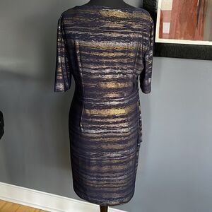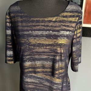 Connected Apparel black w/ metallic gold & silver brushstroke pattern midi. Front laser cut diagonal overlapping tiers. Back with vertical darts. Pullover. Polyester/spandex blend. Lining 100% polyester. 8P. Excellent condition. Nonsmoking home.