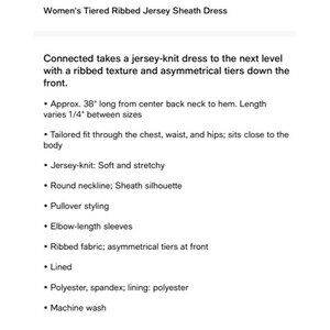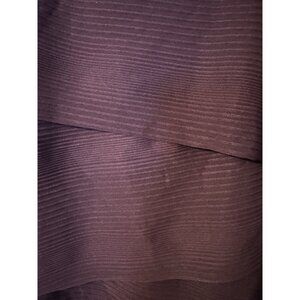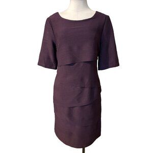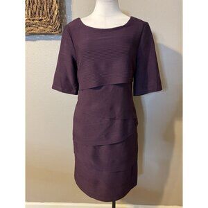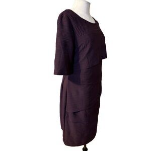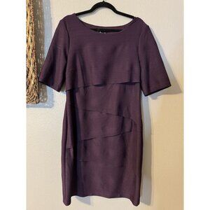 This pretty dress is from Connected Apparel in a misses size 14. Bordeaux purple wine in color. Soft and stretchy, made of 91% polyester, and 9% spandex with a ribbed texture. Polyester lining. Machine washable. Has tiered rows of fabric and pullover style. Unstretched, measured from seam to seam across the front: