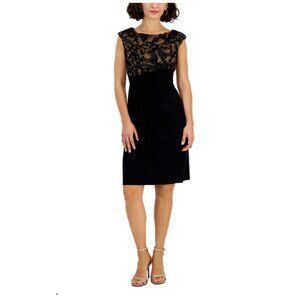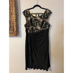 This pretty dress is from Connected Apparel in a misses size 16.  Jet black jersey fabric with a sheer embroidered layer on the top section. Soft and stretchy, made of 96% polyester and 4% spandex.  Hand washable.  Pullover style with stretch.