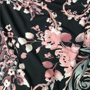 Elegant black dress with pink floral patterns, perfect for any occasion.