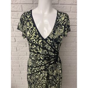 • Green / black print dress with black satin sun bust design