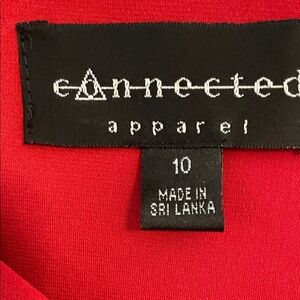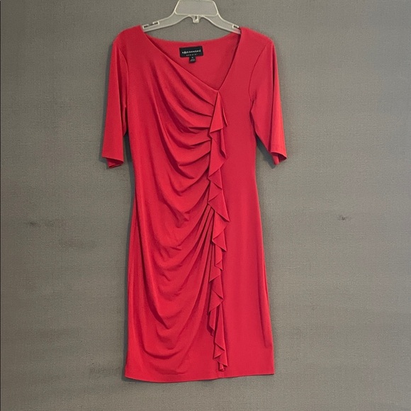 Eye-catching rust dress with cascading ruffle detail down the front. V-neckline creates a flattering silhouette. Elbow-length sleeves for polished coverage. Stretch fabric for easy movement. Ideal for cocktail parties and formal dinners.