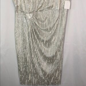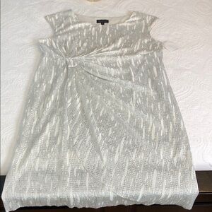 Elegant silver midi dress with a stylish twist front. Perfect for evening events. Mother of the bride, wedding.   Measures from pit to pit 24” Waist 46”