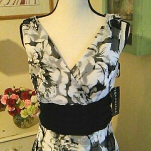 NWT Floaty black and white semi-sheer fabric over a full knit lining in the same design. Wrap front. Wide ruched waistband. Back zip. Size 8 measures , 38 at chest, 30 at waist, full skirt that shows longer that the lining. 44 long from shoulder to hem. So pretty and brand NEW.