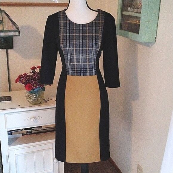 This is one of my favorites. Soft knit. The panel down the front is plaid to waist. At the waist the color changes to mustard. The black sides create a flattering silhouette. Top lined. Back zip. Size 8 measures 38 at chest, 32 at waist, 40 at hips, 39 long from shoulder to hem. Perfect for work or after, and like NEW.