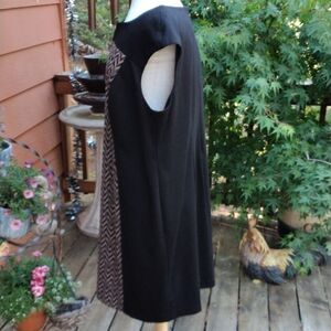 This dark colorblock is figure flattering. Herringbone panel down the front. Cap sleeves. Back zip. Size 20W is 52 at chest, 46 at waist, 54 at hips, 54 at bottom hem. Classic sheath shape. 39 long from shoulder to hem. Comfortable and perfect for work.