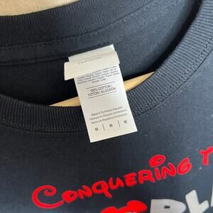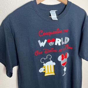 Conquering Epcot Drinking Tee Medium. Preowned and in great condition. Black tee with print on it says "Conquering the World One Drink at a Time." 100% cotton. Please see all photos. Approx measurements in pictures.