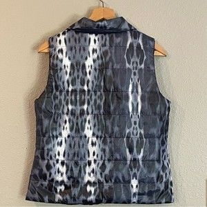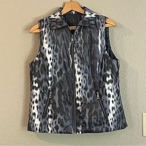 Very nice Conrad C reversible puffer vest. Two pocket front on the animal print side. Full zip. Color is deep navy, the photos look black. Approximate measurements: pit to pit 19 inches, length 23 inches.