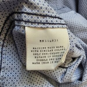 This stylish blue and white button-up shirt with contrasting flip cuffs is in excellent pre-owned condition with no discernable rips or stains! Comfortable and versatile, it is a slim-fit cut with stretch material composed of 97% cotton, 3% spandex. It has an all-over blue and white geometric pattern with contrasting white with pink polka dot fabric lining the inside of the cuffs and inside of the collar. Please see photos for close-ups and tag information!