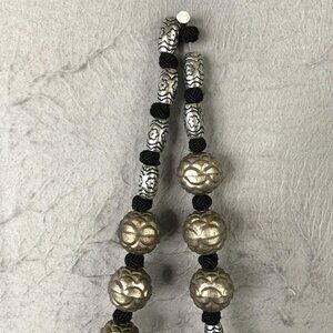 Strap: Decorative beaded handle with large silver-tone and pewter-tone beads on black knotted cord