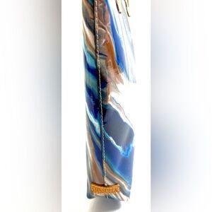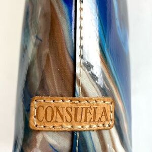 Stylish tote bag featuring a vibrant blue and brown design. Perfect for everyday use. Gently used retired Consuela tote with dual woven straps, key strap and leather accents. See photos for measurements and a tiny stain as seen in last photo.