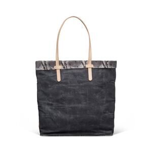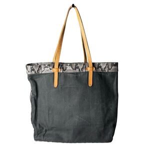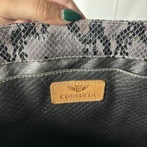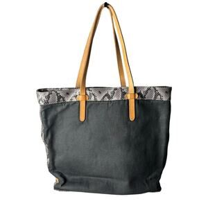 Consuela Flynn Slim Tote in Black / Grey. Features double handle, canvas exterior, snakeskin leather trim, and interior slip pocket. Excellent pre-owned condition.