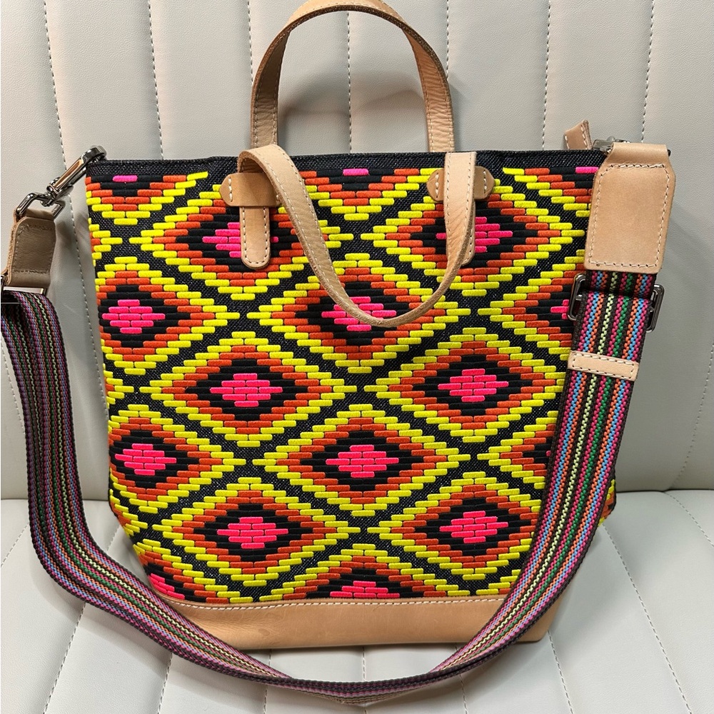 This bag is the Consuela Rae Essential Tote. Part of the "Rae" collection, it features a vibrant, multi-colored geometric pattern on ConsuelaCloth™, which is designed for durability and ease of care.