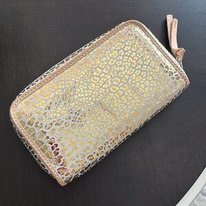 Chic gold wristlet with leopard pattern. Features a secure zip closure and handy wrist strap.