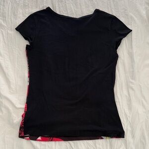 Cutey graphic tee from Contagious In Rock We Trust. Features a v neckline, capped sleeves, and floral and scenic designs.
