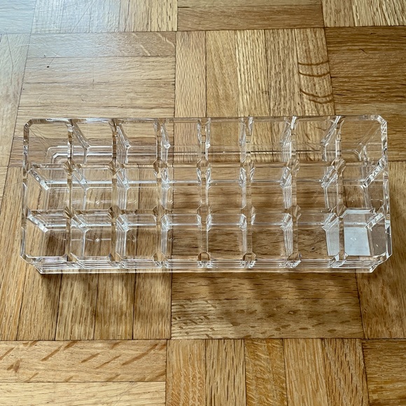 Acrylic lipstick riser. Slightly elevated design makes it easy to quickly find the tube you want. Organize by shade, brand or season. Plus, it coordinates with other acrylic organizers for an attractive, cohesive display. Like new, no scratches, cracks or stains.
