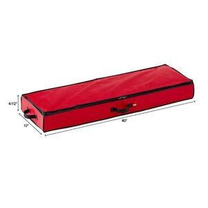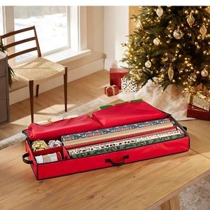 Christmas under bed gift wrap storage from the Container Store. Fits full size wrapping paper rolls. Has removable divider for bows/wrapping accessories and two clear pockets. Also has storage pocket at top.
