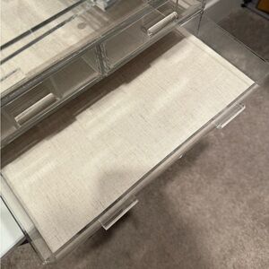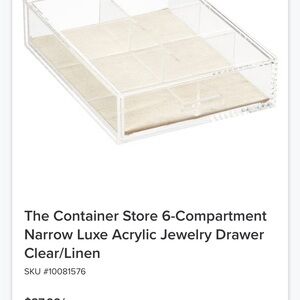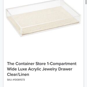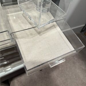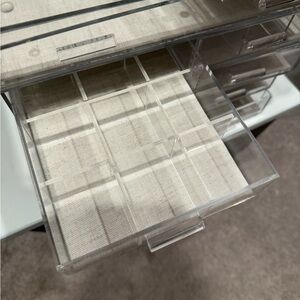 Organize your space with this clear acrylic drawer organizer. Perfect for storing cosmetics, jewelry, and more. The transparent design allows easy visibility of contents. Container store brand with linen lining. Good condition. No stains. Retails over $350 for this entire lot!