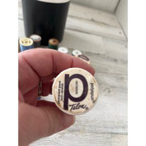 Container of miscellaneous thread. 18 spooks of thread. Some appear vintage. Wooden spools, styrofoam spools. Green blue tan gray black pink. Great pre-owned condition.