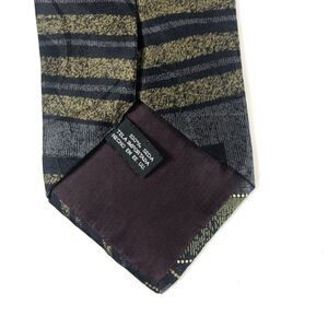 This is a striking men's vintage necktie by the Italian brand, Conte di Milano. It features a bold, abstract, and geometric pattern reminiscent of late 80s or 90s designer style, making it a unique statement piece. The Vintage, Abstract, Geometric, Art Deco Revival design in Black, Olive Green/Moss Green, and Gold/Bronze. The tie is 100% Silk ("100% SEDA / 100% SILK"), printed in Italy and Made in USA (The tie itself was assembled/sewn in the United States. The tie is approximately 4 inches wide at its widest point and 59 inches long.