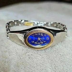 This beautiful silver and gold toned link bracelet watch has a lovely scalloped pattern and a deep, rich blue face. It's a fine accent for a daytime or informal evening look. It has a stainless steel back, quartz movement, and is water resistant.