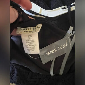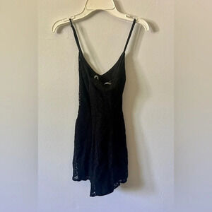 Contempo (Wet Seal brand) all lace black romper with cross strap back, adjustable cami straps, v-neck, mini/above knee length, and zipper back closure.