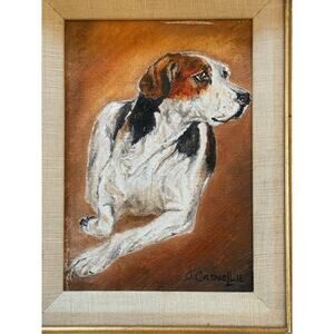 Striking, small-scale oil portrait of a hunting hound by Jane Casnellie (signed “J. Casnellie”), titled on the backing “#297 ‘Blinks Hound I’ 1-26-6 Jane Casnellie (c) 2006.” The composition captures the dog’s head and upper body with finely observed brown, black and white markings and soulful, attentive eyes. Textured, muted brown and yellow background creates a calm, timeless atmosphere. The piece is set in an ornate gold wood frame that complements the palette and elevates the work’s presence.
