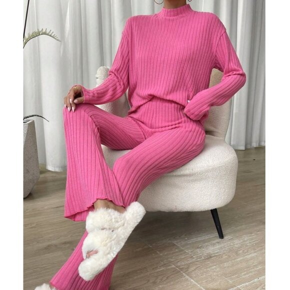 Contemporary Mock Neck Drop Shoulder Tee & Pants Coord Set Pink