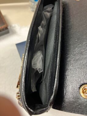 Never Used Mini Purse measures 7 1/2 x 5 1/4 studded all over with rhinestones on faux patent leather structure.
