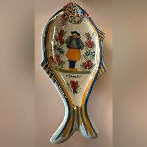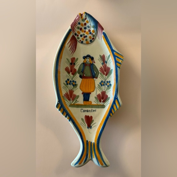 This contemporary example of Quimper pottery can be a lovely addition to your collection or a stand alone example of the artistry of Breton in France. The town of Quimper, and its factory, date back several centuries. This fish plate was decorated as tribute to the seaside town of Carantec in Brittany.