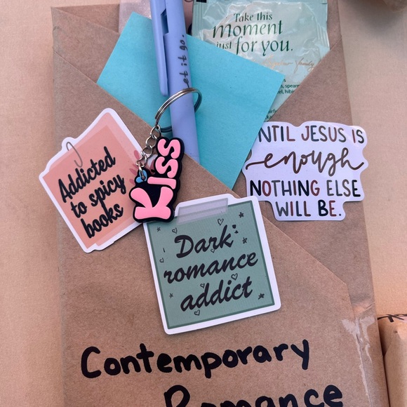 A set of contemporary romance-themed stickers. Includes phrases like 'Addicted to spicy books' and 'Dark romance addict.' Perfect for book lovers.