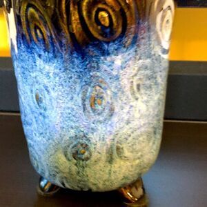 Contemporary vase in a beautiful blue and brown with feet at bottom of vase. Approximately 7”.