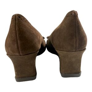 Wedge heel brown suede shoes with design. Great for work or going out. Narrow fit. Very comfortable.