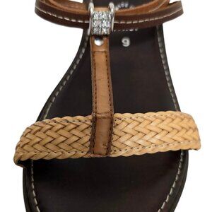Flaws: Slight cracking in the leather vertical strap on each sandal