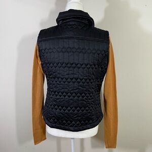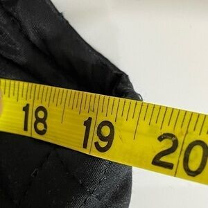 Beautiful black vest Quilted with a dual zipper. The front of the vest is slightly longer and appears to round down to a slight point. The fabric gives a slight satin feel and is very soft. Measurements are armpit to armpit flat fold about 19”. The front length from shoulders is about 25” and the back and sides are about 24”. No visible flaws. Questions please ask and will try to answer as soon as possible. R 1