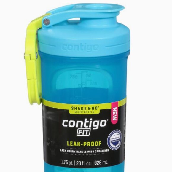 Crafted with convenience in mind, the Contigo Blue Raspberry Fit Shake & Go Antimicrobial Mixer Bottle offers a leak-proof design for secure transport of beverages. It features a practical carry handle equipped with a carabiner for easy attachment to bags. The bottle incorporates antimicrobial product protection, which is intended to inhibit the growth of stain and odor-causing bacteria on the product itself, though it does not protect users against disease-causing bacteria. Users are advised to clean the bottle thoroughly after each use. This mixer bottle, which is BPA free and made in China, also boasts a durable construction and an agitator for effective mixing. It is designed to be easy to clean and is dishwasher safe.