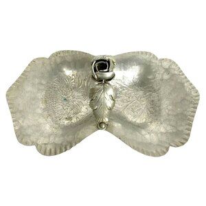 This elegant double dish features a hand-wrought aluminum silver design, ideal for serving candies or nuts. The intricate floral and leaf patterns add a touch of sophistication.