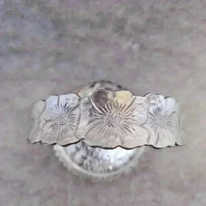 Vintage Aluminum Coasters in Coaster Caddy, coasters are 3 ¾ inch diameter, caddy is 4 inches high, caddy is marked “Continental Silver Co. Inc., Wild Rose, Brilliantone ®, 1001”,