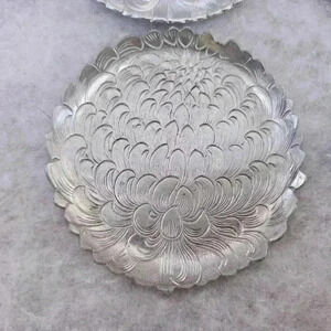 coaster bottoms may have scratches and tarnish from use, some coasters have tarnish on design from use, 2-3 of them show wear, the others look like new, caddy has scratches and wear on bottom from use, hand hammering on handle with the rose design, the coasters and the bottom of the caddy look more like mums but are original, stirrup shape to the caddy with side cut outs, nice aluminum collectible.