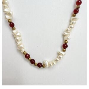 Acrylic white faux pearls, small gold beads and round translucent red art glass beads